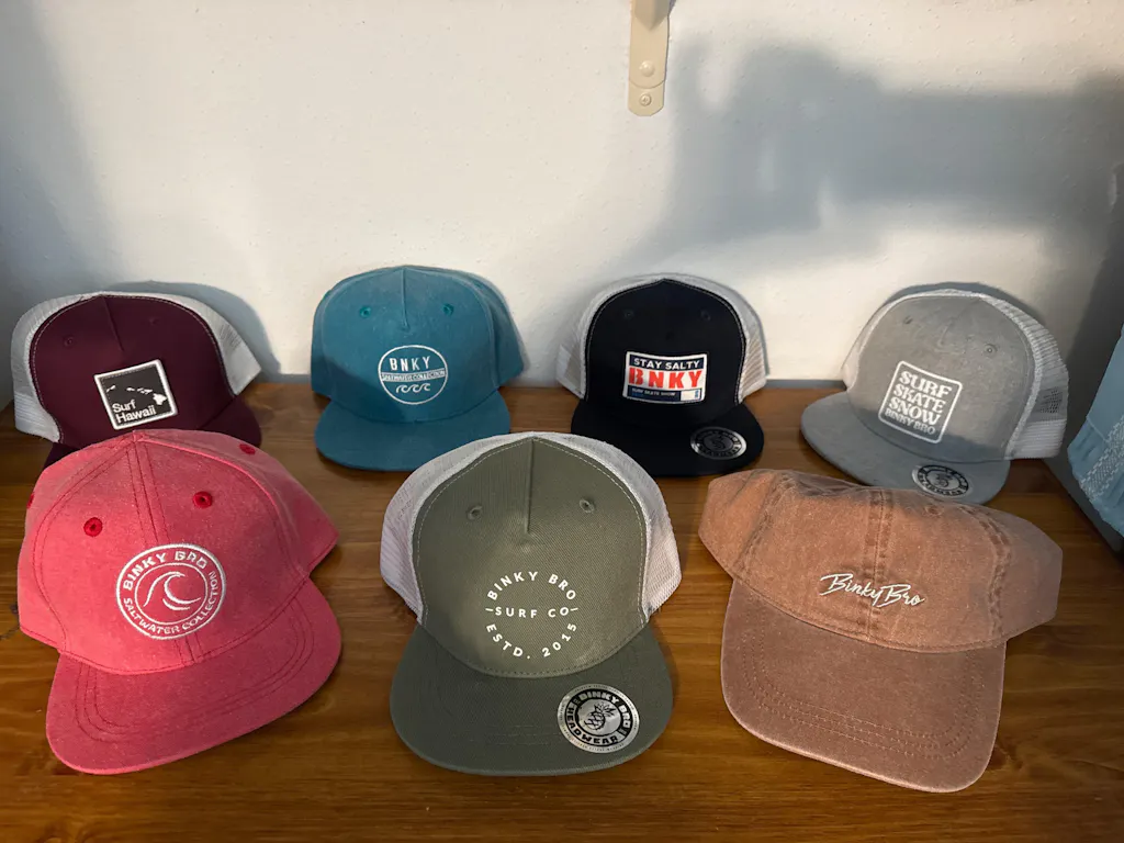 The Bintangs hat has an embossed "Binky Bro Surf Co" logo on the front. All panels and the bill are made from a lighter brown corduroy. The back snap is a matching brown color.