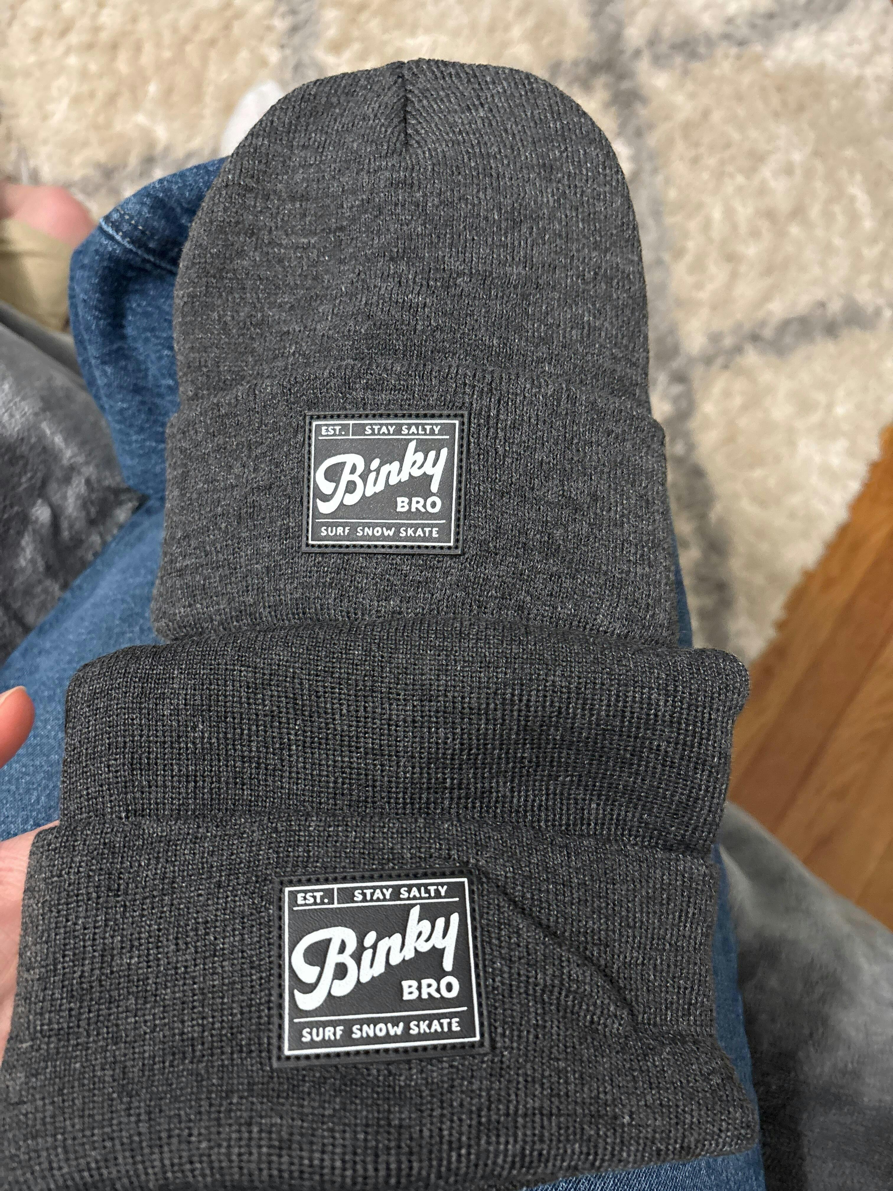 Our Charcoal Park City beanie is 100% acrylic. It has a "BinkyBro Surf Snow Skate" embossed patch on the front. Sizes are currently available in newborn, infant, toddler, youth, and adult.