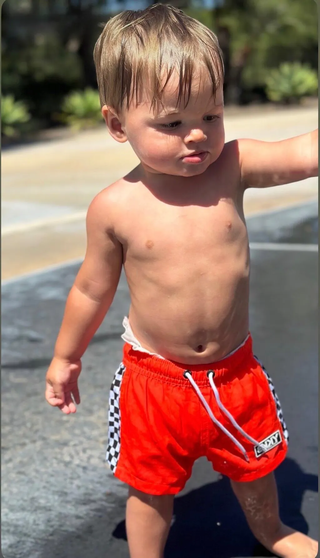 Our swimsuits are styled after a more euro-fit. Meaning, the length of the shorts will land anywhere between a little above the knee to mid-thigh-ish (depending on the length of the child). It is designed this way--its our style!