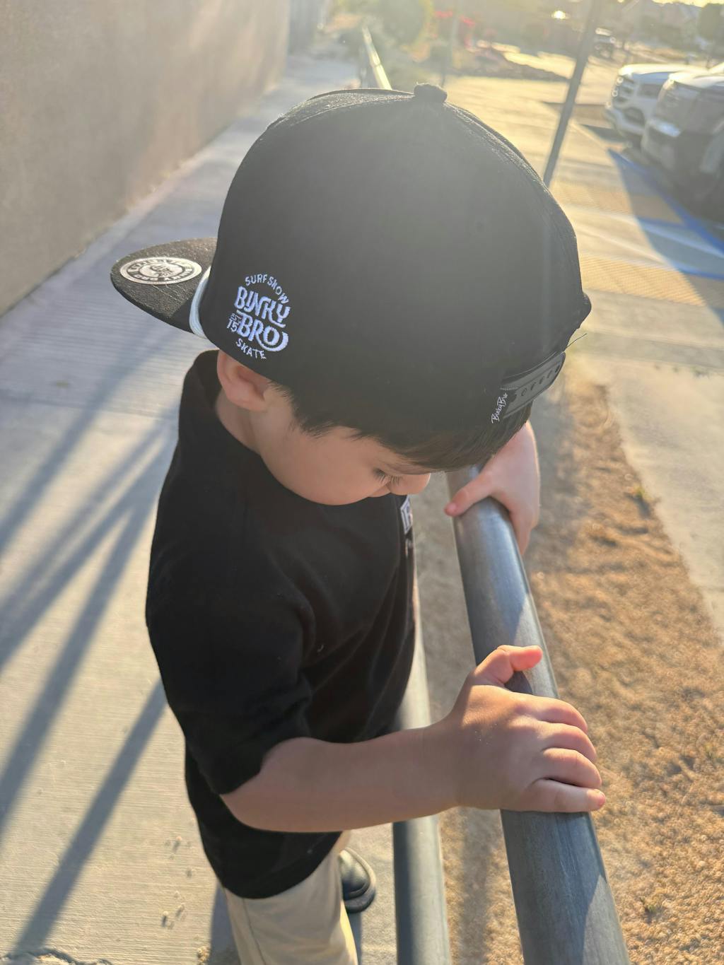 The Honolua infant/baby, toddler, youth snapback hat has a navy blue suede brim, grey tri-blend paneling, a BinkyBro embroidered "Surf Hawaii"patch, with a snapback.